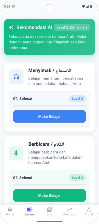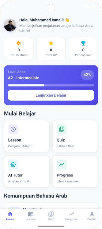 Selamat datang di platform pertama yang menyediakan pembelajaran bahasa Arab adaptif. Kami memanfaatkan teknologi Kecerdasan Buatan (AI) untuk menciptakan pengalaman belajar yang personal bagi Anda.